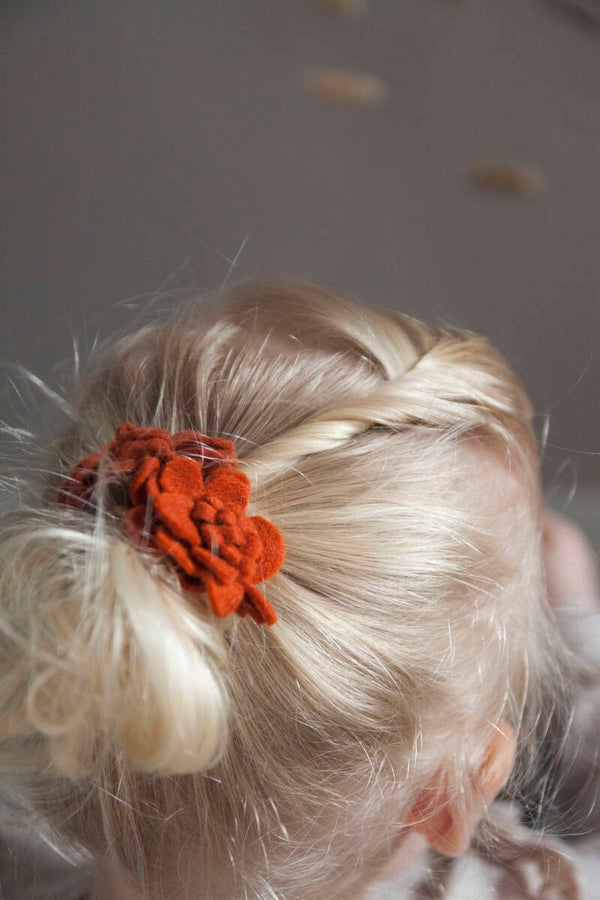 Deze prachtige vilt bloem wordt met de hand gemaakt en daarna bevestigd op een elastiekje. Het is mogelijk om te kiezen tussen verschillende kleuren elastiekjes.